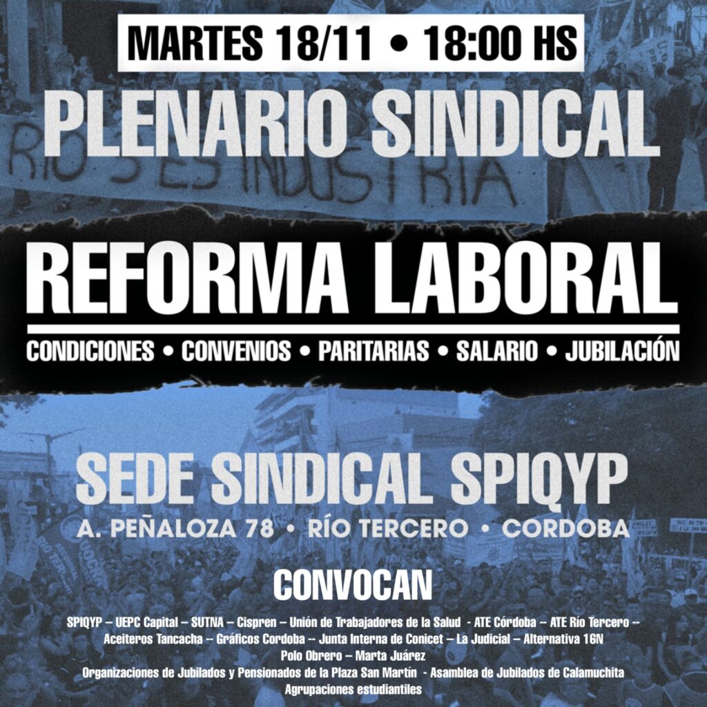 Este martes a las 18 horas se realizará en Río Tercero el Plenario Sindical convocado por organizaciones sindicales combativas para abordar la Reforma Laboral regresiva que pretende imponer el gobierno de Javier Milei.