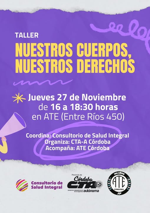 “Porque defender nuestros cuerpos y nuestras decisiones es parte de la lucha diaria de las y los trabajadores”, invita el Consultorio de Salud Integral, con el acompañamiento de CTA Autónoma Córdoba y ATE Córdoba.