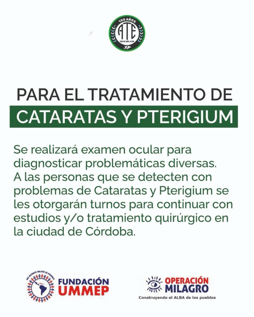 La iniciativa forma parte de la Operación Milagro que el Centro Oftalmológico realizará en la sede de ATE Cruz del Eje, Avellaneda 123, con un cupo de 100 personas.