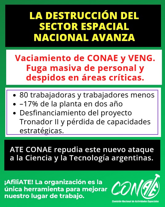 Desde ATE CONAE repudiamos los nuevos despidos en la empresa VENG S.A., parte fundamental de lo que supo ser el Plan Nacional Espacial y que hoy es una sombra de lo que fue, por exclusiva responsabilidad de la actual gestión del gobierno nacional encabezada por Javier Milei.