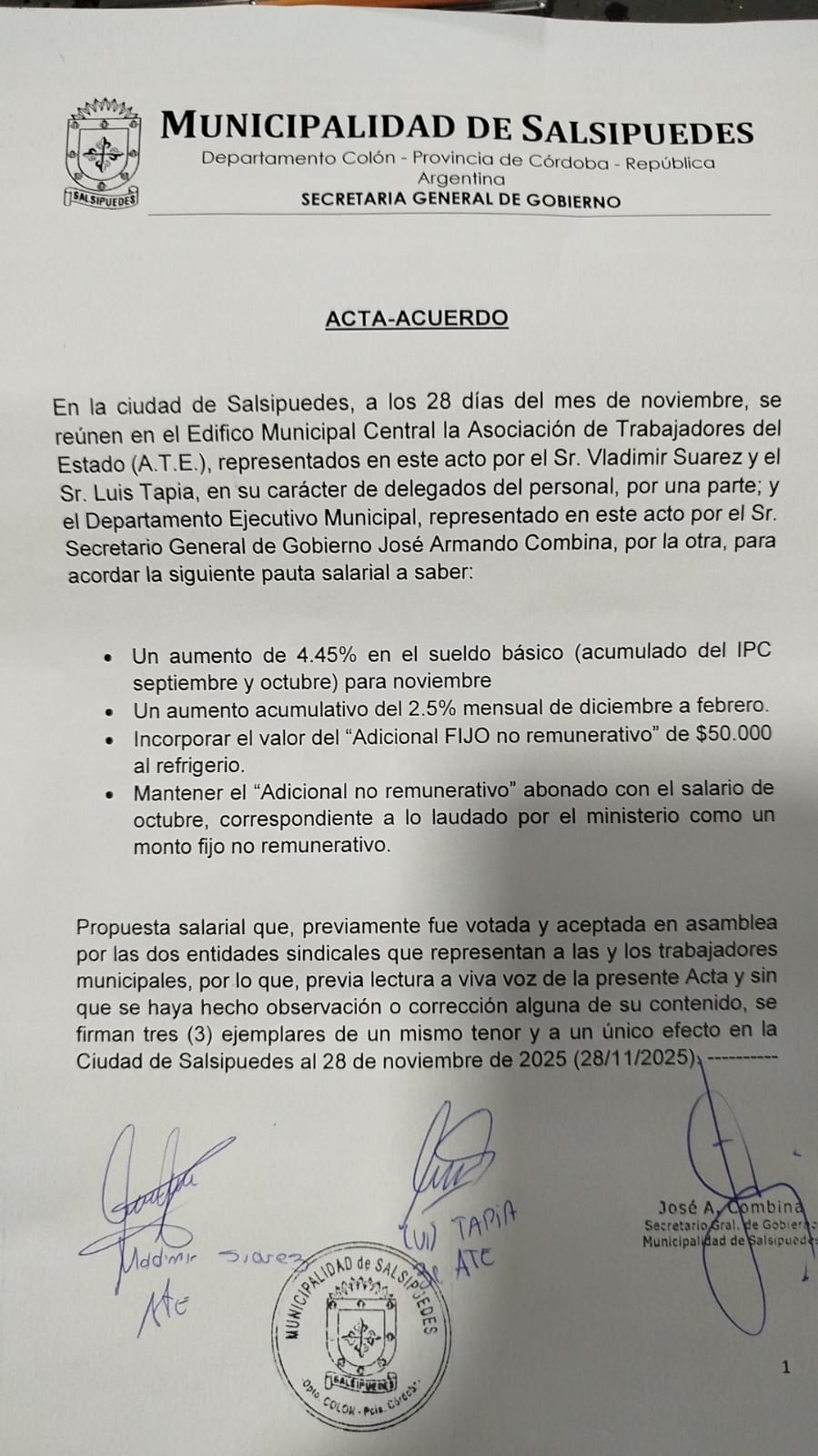 En una audiencia con el Departamento Ejecutivo de la Municipalidad de Salsipuedes, realizada el viernes pasado, ATE cerró la discusión salarial para los y las trabajadoras de la localidad para el tramo noviembre-febrero de 2026.
