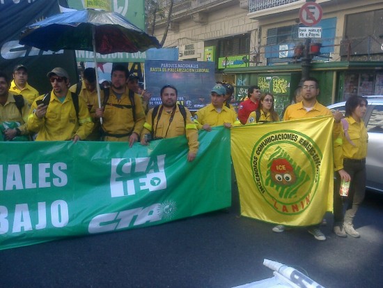 “Venimos apoyar el reclamo de los compañeros brigadistas, además para reclamar que las autoridades de parques nacionales escuchen el pedido de convenio colectivo y el pase a planta de los brigadistas y de los compañeros contratados resolución 48. La precarización llega al punto que entre los dos sectores sumamos 800 trabajadores sin estabilidad laboral, 500 brigadistas y 300 contratados. Una vez que pasemos a planta, la prioridad es que discutamos un verdadero convenio que incluya a todos los trabajadores de la APN y no el convenio parcial actual que sobre incluye a los guardaparques”, explicó Leonardo Barrios Caro.