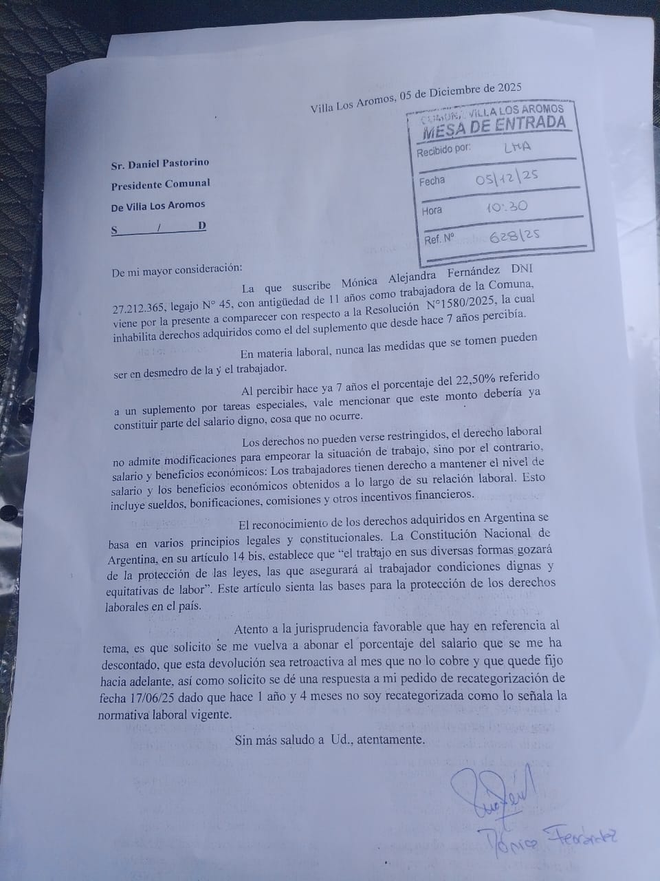 En consecuencia, reclamó la devolución del suplemento con carácter retroactivo a todos los meses en que fue descontado y la apertura de una mesa de diálogo para abordar la problemática. Fernández lleva 11 años de trabajo ininterrumpido en la Comuna Los Aromos.