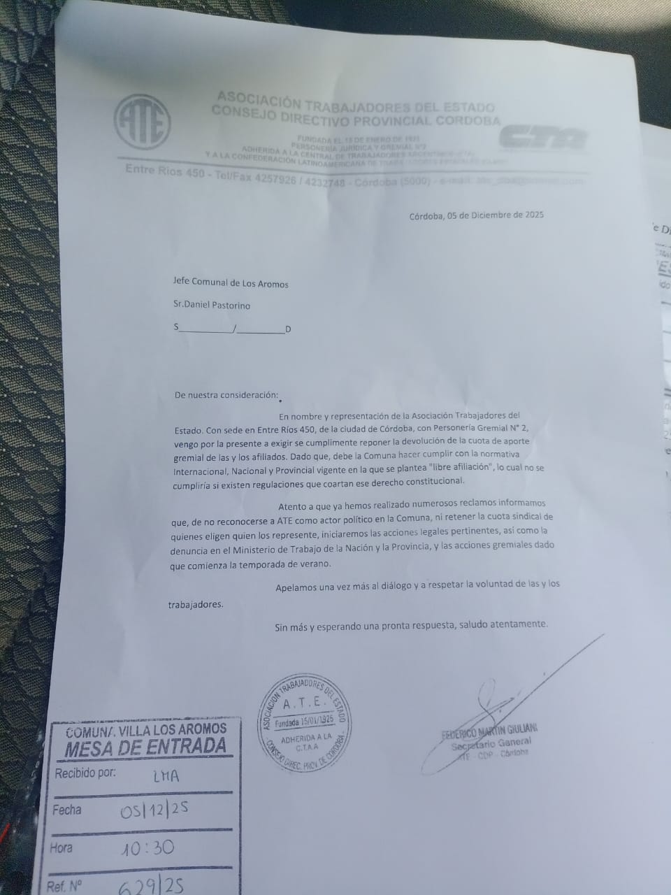 En una nota dirigida a la Comuna de Los Aromos, ATE Córdoba reclamó al jefe comunal Daniel Pastorino que ejecute la retención de la cuota sindical de nuestros afiliados y afiliadas del sector “dado que es deber de la Comuna cumplir la normativa internacional, nacional y provincial vigente en materia de libre afiliación. La misiva fue ingresada por la delegada de ATE Alta Gracia, Cintia Rosales, junto al compañero Javier López..