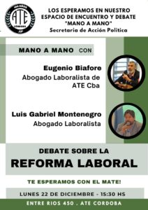 ATE cerró ayer el ciclo “Mano a Mano” de la Secretaría de Acción Política con una charla-debate sobre las Reforma Laboral con la participación de los abogados laboralistas Eugenio Biafore y Luis Gabriel Montenegro.