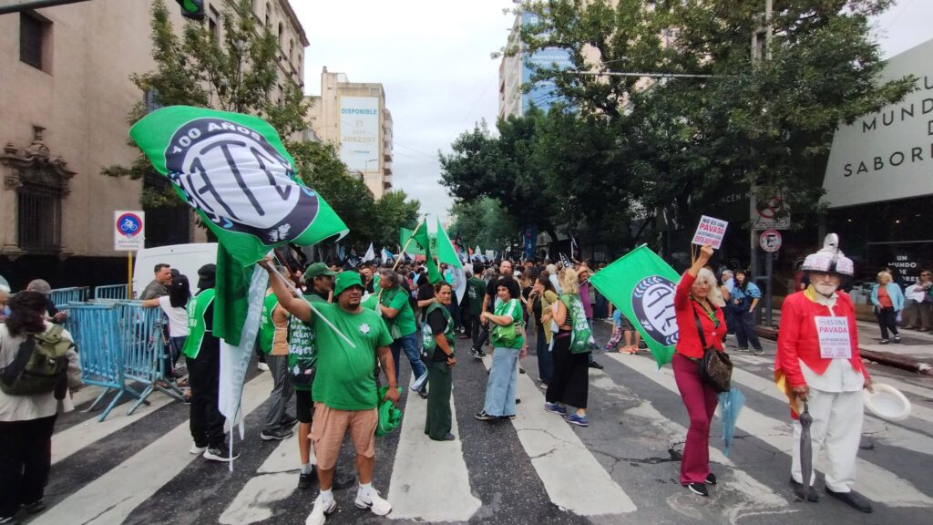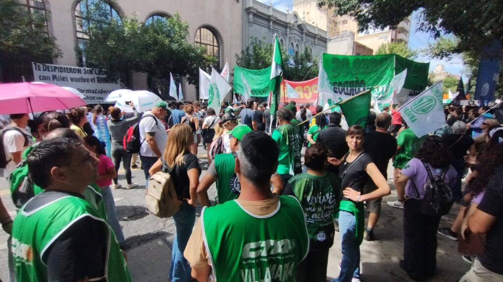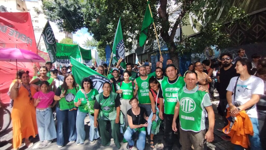 En ese marco, ATE Córdoba movilizó a la sede de la casa histórica de la CGT, donde miles de manifestantes se expresaron en repudio al proyecto oficial, al grito de “Milei basura, vos sos la dictadura”.