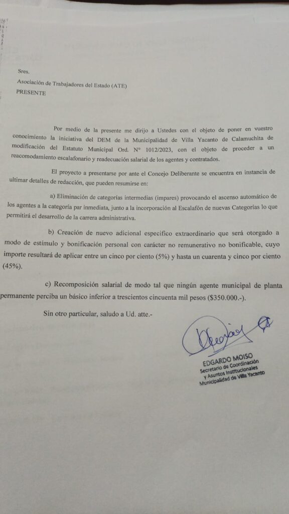 A partir de la propuesta de renovación del Estatuto Municipal de Villa Yacanto de Calamuchita impulsada por ATE Córdoba, el secretario de Coordinación y Asuntos Institucionales de la Municipalidad, Edgardo Moiso, notificó a nuestra organización que el Ejecutivo enviará al Concejo Deliberante el proyecto de ordenanza, con el objetivo de proceder al reacomodamiento escalafonario y su consiguiente readecuación salarial.