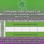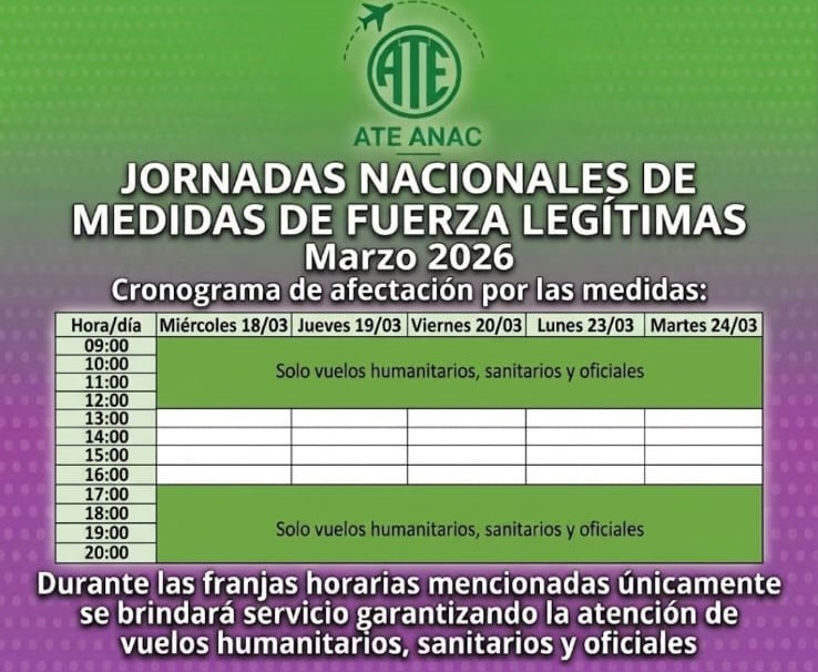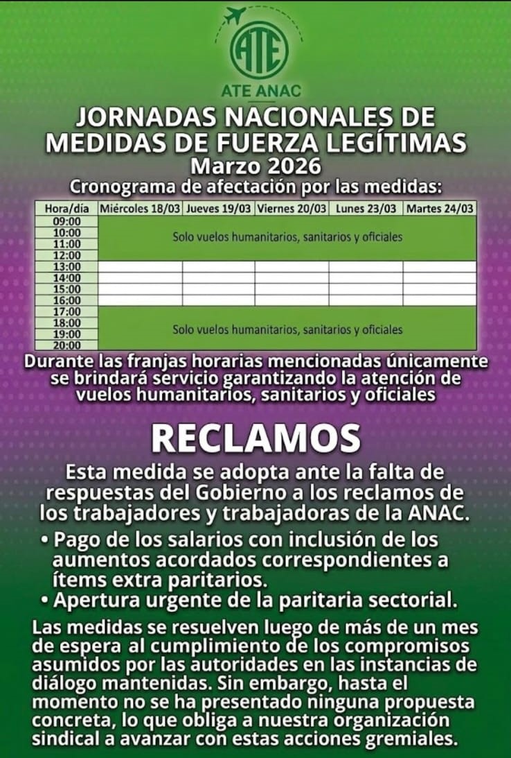 El plan de lucha se desarrollará con paros parciales de tres horas por jornada, los días 18,19,20,23 y 24 de marzo próximo, de 13 a 16 horas. Durante ese tramo diario, ATE notificó a la Secretaría de Trabajo de la Nación que solo se garantizará la atención de vuelos sanitarios, humanitarios y oficiales.