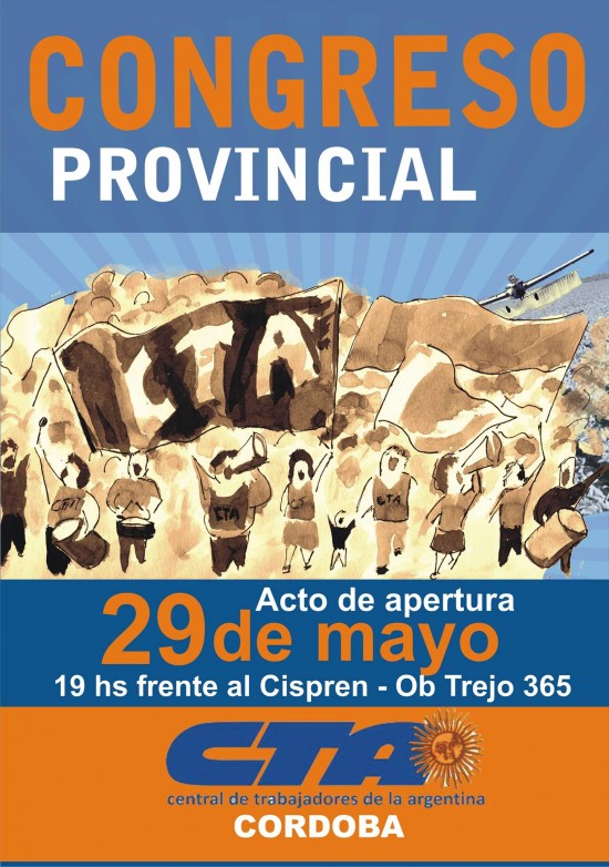 La Central de Trabajadores de la Argentina (CTA Autónoma) de la Provincia de Córdoba ha convocado a Congreso Provincial para los días 29 y 30 de mayo. La actividad se iniciará el viernes, en consonancia con un nuevo aniversario del Cordobazo con un acto frente a la sede del Cispren, Obispo Trejo 365 de la ciudad capital, a las 18 horas.