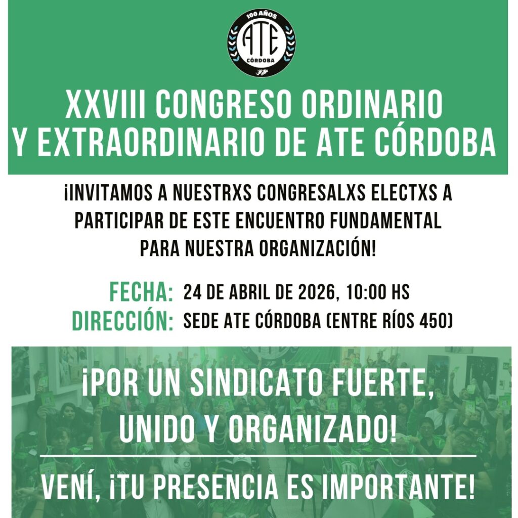 Este próximo viernes 24 de abril se realizará el XXVIII Congreso Ordinario y Extraordinario de ATE Córdoba.