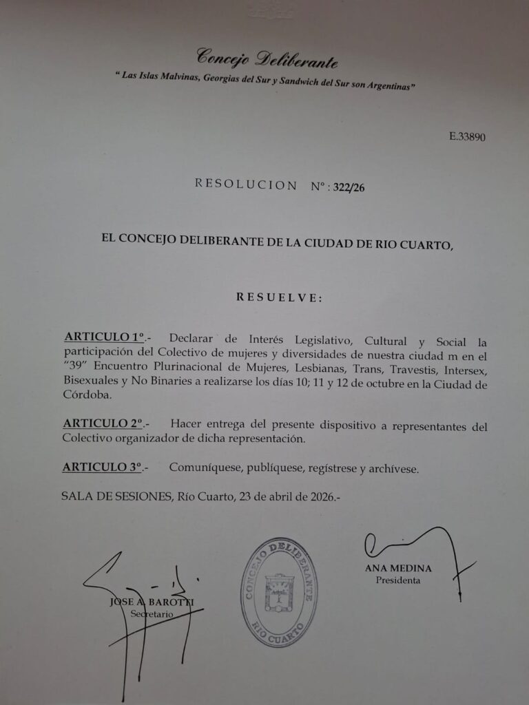 En la sesión realizada esta mañana, el Concejo Deliberante de la ciudad de Río Cuarto declaró de interés el 39º Encuentro Plurinacional de Mujeres, Lesbianas, Trans, Travestis, Intesex, Bisexuales y No Binaries, que se realizará en Córdoba Capital los días 10, 11 y 12 de octubre.