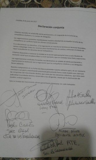 Tras expresas las posiciones de cada gremio, los gremios firmaron un documento que señala que “las organizaciones presentes manifestamos nuestra voluntad de acompañar la lucha de los compañeros en conflicto hasta las últimas consecuencias”.
