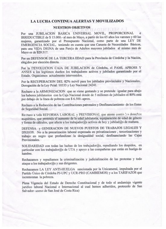 Además, estuvo presente el Sindicatos de Músicos de Córdoba, con la presencia del compañero Brozzo y la agrupación de retirados de la Policía y Servicio Penitenciario, con los compañeros Darío Almada, Raúl Ricardo Romero, Gomez y demás miembros.