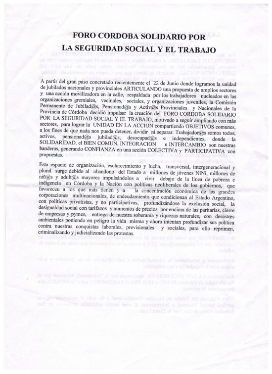 ATE participó ayer de la conformación en la sede lucifuercista del Foro Córdoba por la Seguridad Social y el Trabajo. Los compañeros que organizaron la convocatoria estimaron que el acto fue un éxito total porque la unidad entre jubilados nacionales y jubilados provinciales se consolidó y surgió el compromiso de luchar todos juntos.