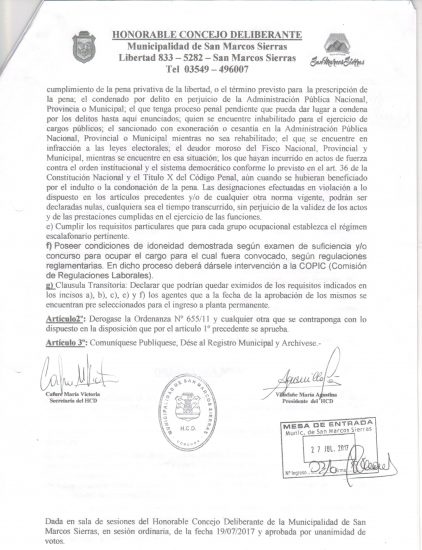 Tras los planteos realizados por ATE en el marco de la mesa de relaciones laborales que creo el año pasado la Municipalidad de San Marcos Sierra, el Consejo Deliberante modificó el estatuto de los trabajadores municipales a través de la ordenanza 836/17, aprobada el 27 de julio pasado.