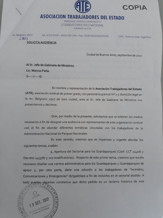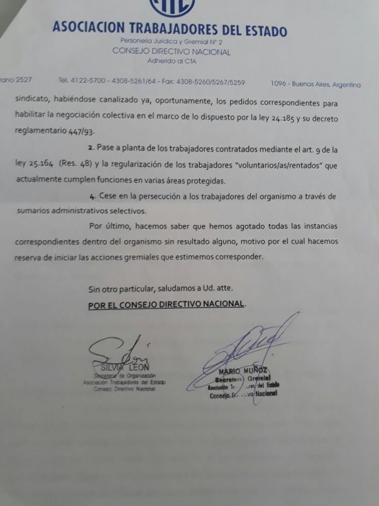 Con la firma de la secretaria de Organización, Silvia León, y del secretario Gremial, Mario Muñoz, el Consejo Directivo Nacional solicitó una audiencia para abordar la problemática del sector Parques Nacionales ya que se encuentran agotadas las instancias administrativas dentro del organismo.