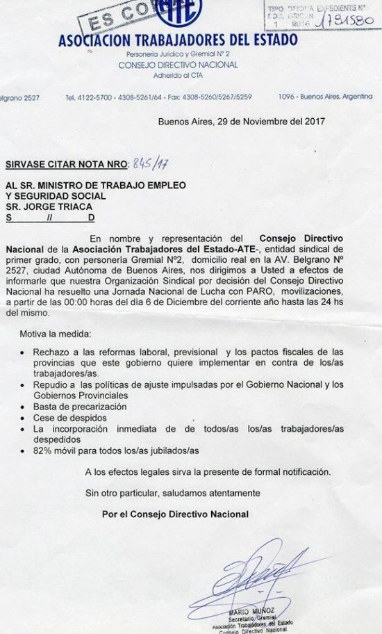 El Consejo Directivo Provincial convoca a los trabajadores estatales de Córdoba, en los tres niveles de gobierno (nacional, provincial y municipal) a realizar el paro nacional de actividades del próximo 6 de diciembre.