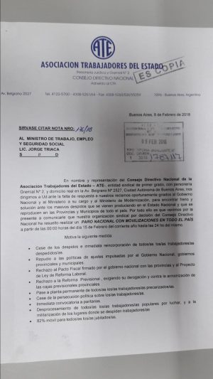 el próximo 15 de febrero en el marco del paro nacional que ATE convoca en repudio a la política de despidos del gobierno de Macri. En tal sentido, los representantes de ATE diversos organismos con presencia en Córdoba están sufriendo el impacto de esas medidas arbitrarias e injustificadas que tienen como único fin ajustar a los trabajadores y reducir la presencia del Estado y la prestación de servicios públicos, para favorecer a las corporaciones.